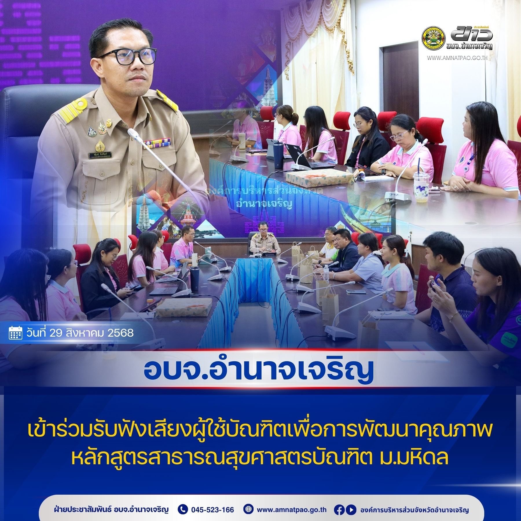 วันที่ (29 สิงหาคม 68) อบจ.อำนาจเจริญ ร่วมประชุมโครงการรับฟังเสียงศิษย์เก่าและผู้ใช้บัณฑิตเพื่อการพัฒนาคุณภาพหลักสูตร สาธารณสุขศาสตรบัณฑิต