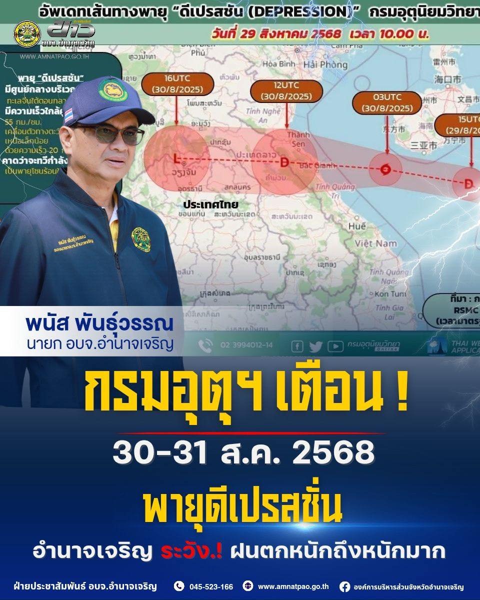 กรมอุตุฯประกาศเตือน! พายุดีเปรสชัน พื้นที่จังหวัดอำนาจเจริญจะมีฝนตกหนักถึงหนักมากในวันที่ 30 - 31 สิงหาคมนี้  “อบจ.อำนาจเจริญ ร่วมสร้างอำนาจเจริญให้น่าอยู่ สู่..มหานครแห่งความสุข”