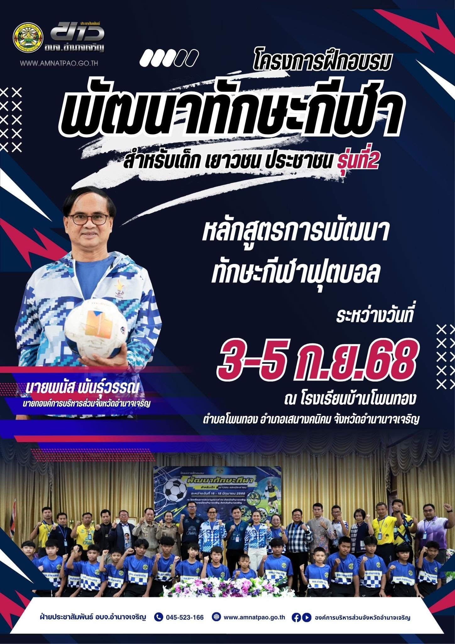 อบจ.อำนาจเจริญ มุ่งขับเคลื่อนนโยบายด้านกีฬา จัดโครงการฝึกอบรมพัฒนาทักษะกีฬาสำหรับเด็ก เยาวชนและประชาชน (รุ่นที่ 2) หลักสูตรการพัฒนาทักษะกีฬาฟุตบอล ในระหว่างวันที่ 3–5 กันยายน 2568 ณ โรงเรียนบ้านโพนทอง ตำบลโพนทอง อำเภอเสนางคนิคม จังหวัดอำนาจเจริญ