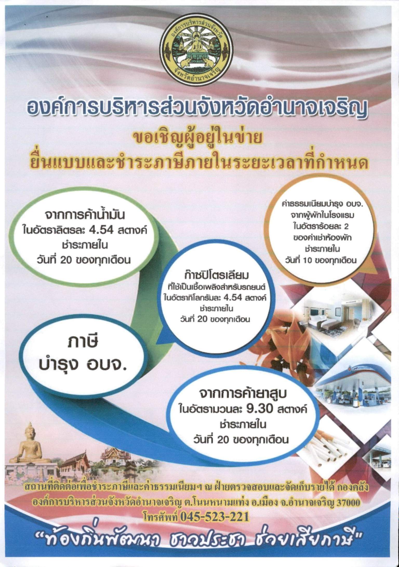 อบจ.อำนาจเจริญ ขอเชิญผู้อยู่ในข่ายยื่นแบบและชำระภาษีภายในระยะเวลาที่กำหนด